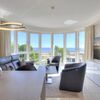 Blickfang des Wohnzimmers ist das formschöne Sofa mit passendem Sessel und Tisch. Gleiches gilt auch für die auf Sofa und Sessel abgestimmte wunderschöne Beleuchtung. Der gemütliche Wohnbereich sorgt mit seinen blauen und gelben Farbakzenten für eine heitere Urlaubsstimmung. FlatTV und Internet-Anschluss versüßen Ihre Urlaubstage. Im Handumdrehen kann das Sofa als komfortable Schlafgelegenheit für die 3. und 4. Person genutzt werden. Die Aufbettung für ein Kind ist im Wohnzimmer im Babyreisebett (max. 3 Jahre) möglich.