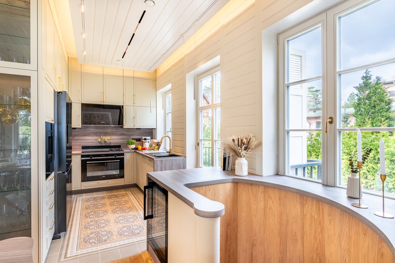 Die von einem regionalen Tischler gefertigte Küchenzeile mit angrenzendem Balkon überzeugt durch höchste Handwerkskunst und umfassende Ausstattung: Cerankochfeld, Backofen, Mikrowelle, Side-by-Side-Kühlschrank mit Wasser- und Eiswürfelspender, Weinkühlschrank, Geschirrspüler sowie ein Kaffeevollautomat – ideal für den Espresso am Morgen oder den Cappuccino nach dem Strandspaziergang.