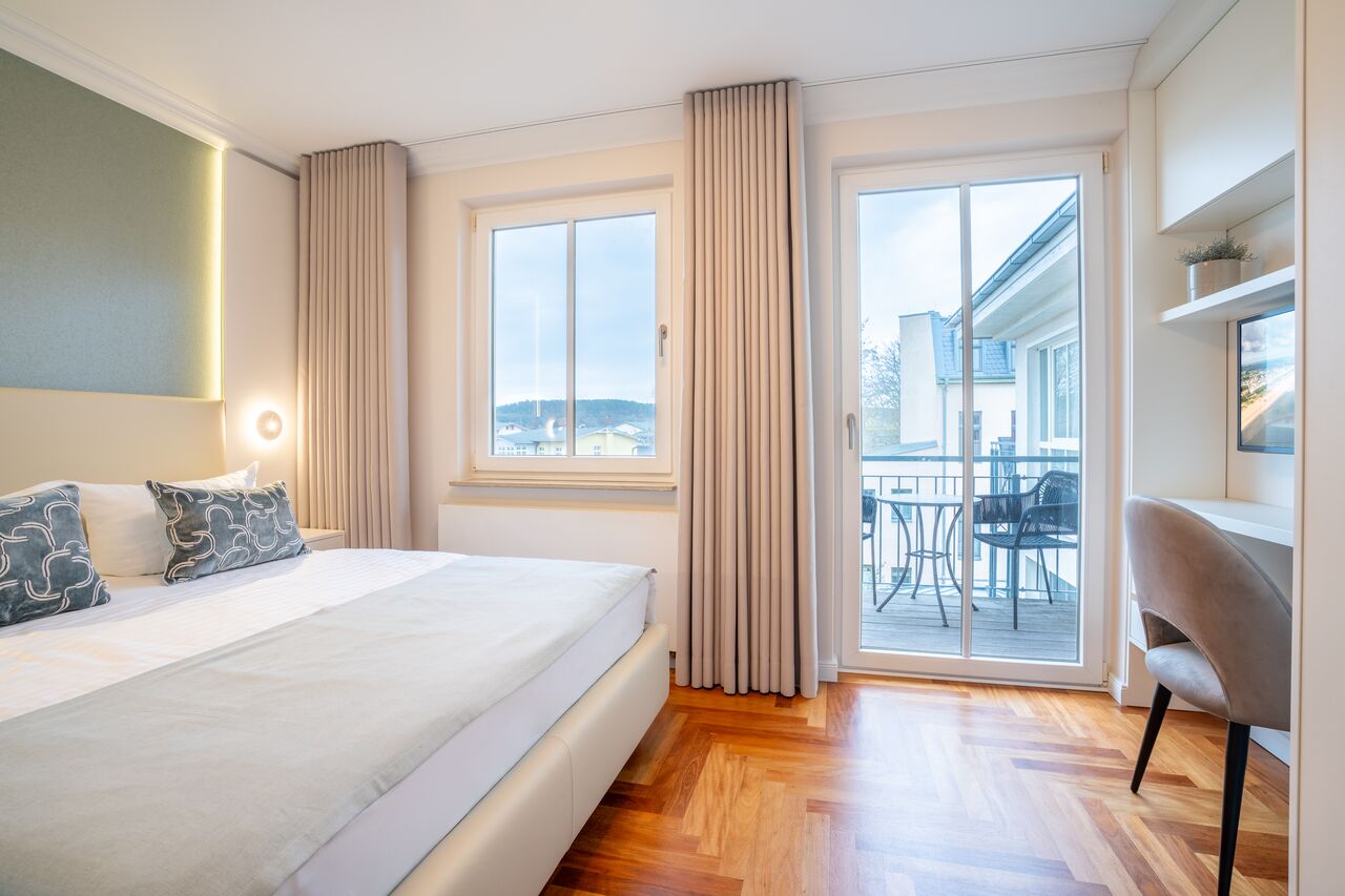 Auf dem großzügigen Nordost-Balkon können Sie das Frühstück bei fantastischem Sonnenaufgang und traumhaftem Meerblick genießen. Ein absolutes Highlight ist der Blick auf die Seebrücke Ahlbeck, die älteste Seebrücke Deutschlands.